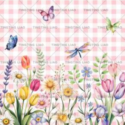 Spring,Flowers,Tulips,Daisy,Leaves,Dragonflies,Butterflies,Watercolor,Pink Ribbon