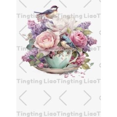 Vintage Tea Cups,Flowers,Birds,Watercolor Style,Utensils