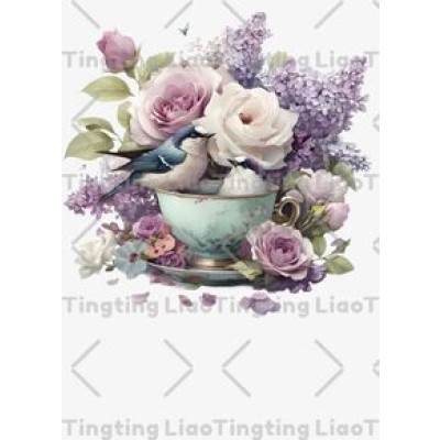 Vintage Tea Cups,Flowers,Birds,Watercolor Style,Utensils