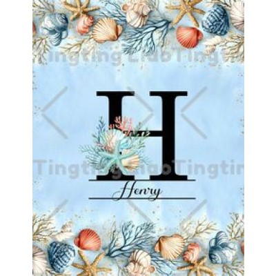 Letter Customization,Vintage,Ocean,Sandy Beach,Shells,Corals,Blue