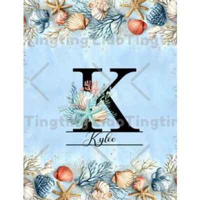 Letter Customization,Vintage,Ocean,Sandy Beach,Shells,Corals,Blue