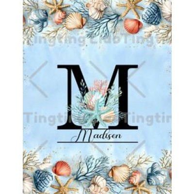 Letter Customization,Vintage,Ocean,Sandy Beach,Shells,Corals,Blue