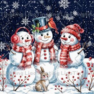 Christmas,Winter,Christmas Tree,Watercolor Style,Snowman,Robin,Berry,Rabbit