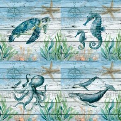 Ocean Beach Theme,Animal,Turtle Seahorse Octopus Whale,Starfish,Shell,Coral,Seagrass,Compass,Wood Grain
