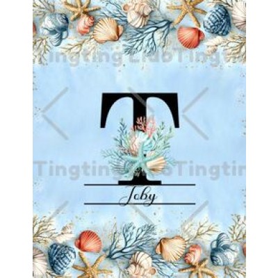 Letter Customization,Vintage,Ocean,Sandy Beach,Shells,Corals,Blue