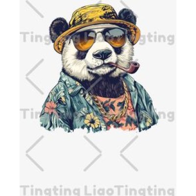A Panda In A Flowered Shirt And Hat,Smoking A Pipe.