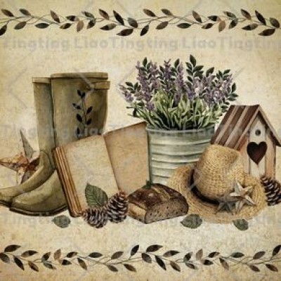 Farmhouses,Countryside,Boots,Grass Caps,Flower Pots,Pine Fruit,Leaves,Vintage,Parchment Background
