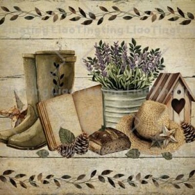 Farmhouses,Countryside,Boots,Grass Caps,Flower Pots,Pine Fruit,Leaves,Vintage,Woodcut