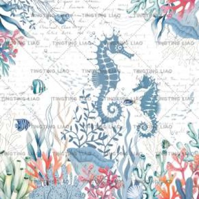 Marine Life,Seahorses,Corals,Watercolors,Small Fish,Retro