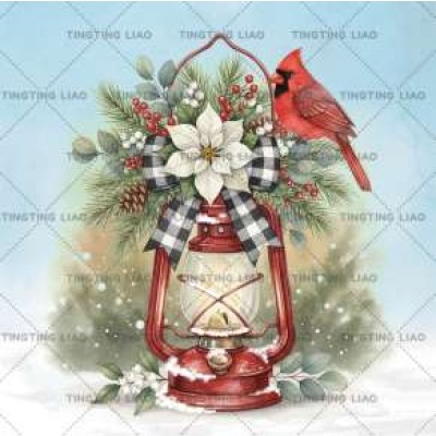 Christmas,Kerosene Lamp,Cardinal Bird,One Red,Pine Needle,Watercolor,Art,Decoration