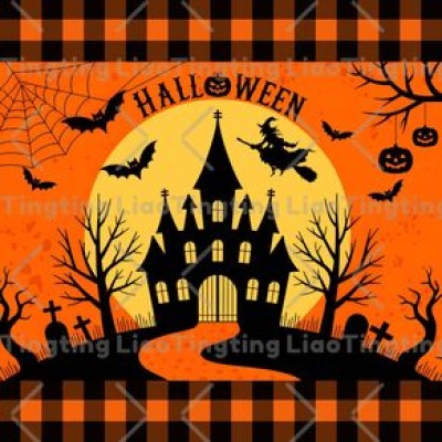 Halloween,Castle,Bat,Spider Web,Tombstone,Witch,Pumpkin,Text,Cartoon,HALLOWEEN,Plaid