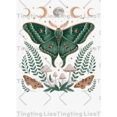 Moth,Mushroom,Plant,Moon Phase,Stars,Illustration,Nature,Mysterious