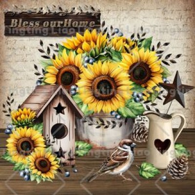 Farmhouses,Sunflowers,Sparrows,Pine Fruit,Village Heart,Text,Countryside,Vintage Paper Background