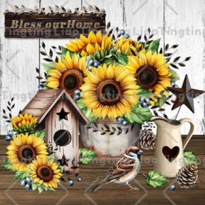 Farmhouses,Sunflowers,Sparrows,Pine Fruit,Village Heart,Text,Countryside,White Woodcut