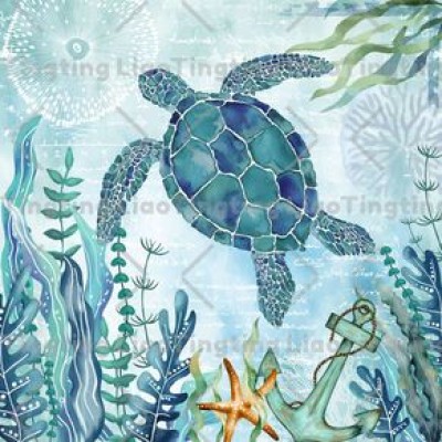 Summer,Retro Sailing,Marine Life,Teal,Turtle,Seaweed,Starfish,Anchor