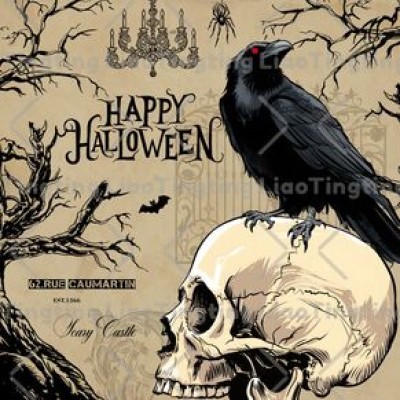 Halloween,Pumpkin,Skull,Hat,Bone,Bat,Potion,Crow,Cartoon,Purple Background