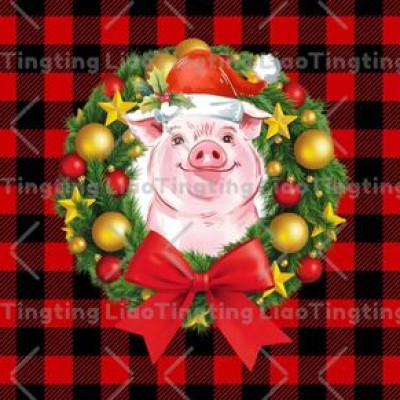 Christmas,Winter,Farm,Animal,Pig,Christmas Hat,Christmas Wreath,Red Plaid