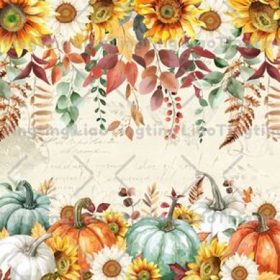Thanksgiving,Autumn,Sunflower,Leaf,Plant,Flower,White Pumpkin,Orange Pumpkin,Green Pumpkin,Beige Vintage Letter Background
