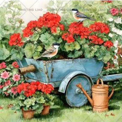 Spring,Farmhouses,Flowers,Birds,Watercolor
