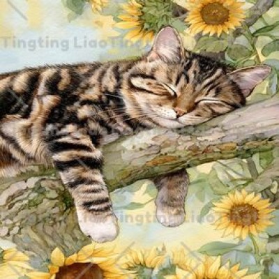 Watercolor,Sunflower,Retro,Flower,Cat,Branch