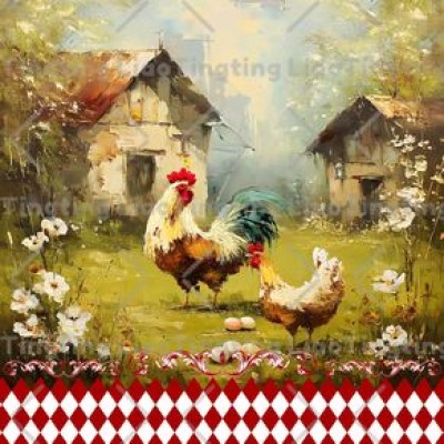 Farmhouse,Rooster,Hen,Vintage,Art,Decoration,Oil Painting