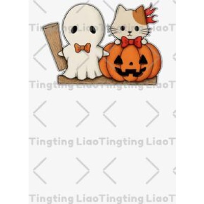 Cartoon,Halloween,Cat,Ghost,Pumpkin,Bow,Wood