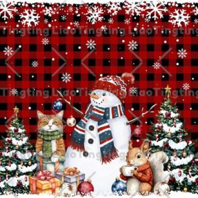 Christmas,Snowman,Christmas Tree,Snowflake,Squirrel,Cat,Red Plaid