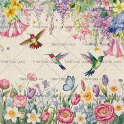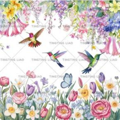 Spring,Flowers,Purple Vineflowers,Tulips,Honeybirds,Watercolor Style