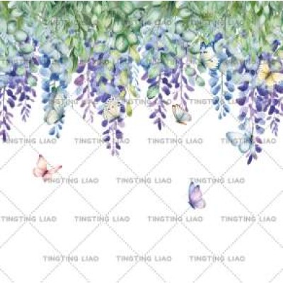 Spring,Plants,Eucalyptus Leaves,Butterflies,Purple Flowers,Watercolor Style