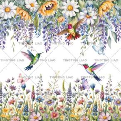 Spring,Plants,Eucalyptus Leaves,Hummingbirds,Purple Flowers,Sunflowers,Daisy,Watercolor Style