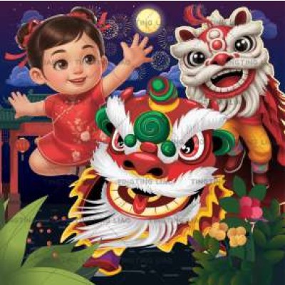 Happy New Year,Dance Lions,Fireworks,Art,Decoration,Retro