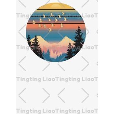 Illustration,Landscape,Round,Snow Mountain,Water,Birds,Forest,Nature,Sunset