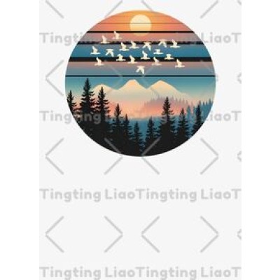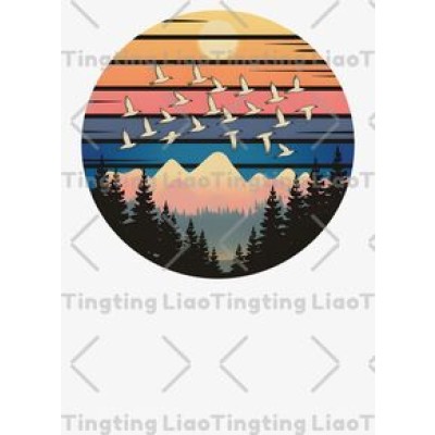 Illustration,Landscape,Round,Snow Mountain,Water,Birds,Forest,Nature,Sunset