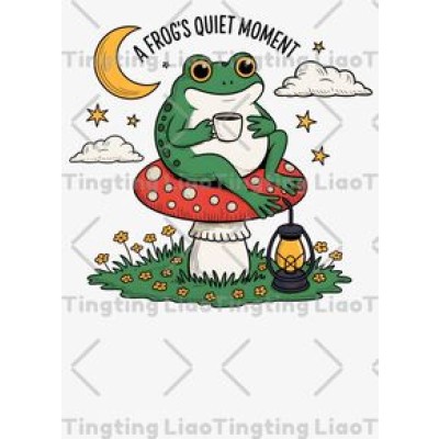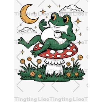 A Frog's Quies Moment,Obesity,Frog,Red And White Spotted Poisonous Mushroom,Coffee Cup,Golden Crescent Moon,White Clouds,Golden Stars,Yellow Wild Flowers,Light