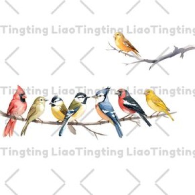Watercolor,Vintage,Bird,Branch,Row Of Birds