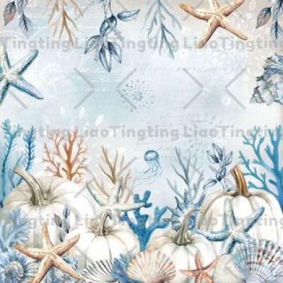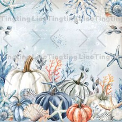 Thanksgiving,Autumn,Coastal,Pumpkin,Starfish,Shell,Coral,Blue Background