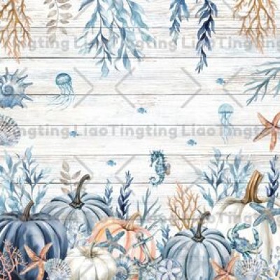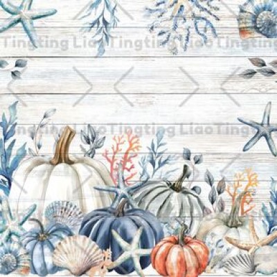 Thanksgiving,Autumn,Coastal,Pumpkin,Starfish,Shell,Coral,Blue Wood Grain Background