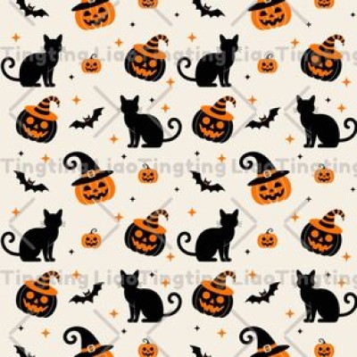 Halloween,Cat,Pumpkin,Bat,Stars,Cream Background