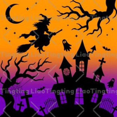 Halloween,Castle,Moon,Ghost,Bat,Witch,Spider Web,Cartoon,Gradient