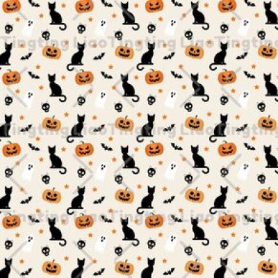 Halloween,Cat,Pumpkin,Spider Web,Ghost,Bat,Stars,Cream Background