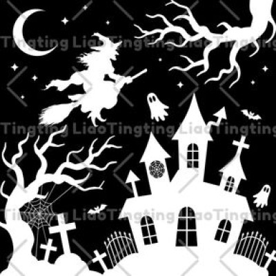 Halloween,Castle,Moon,Ghost,Bat,Witch,Spider Web,Cartoon