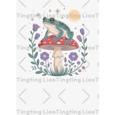 Fantasy,Illustration,Frog,Sitting,Mushroom,Flower,Grass,Stars,Surround,Nature,Fantasy