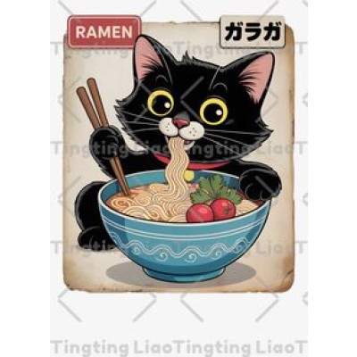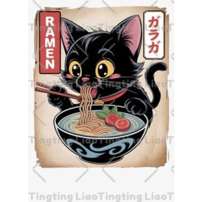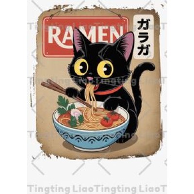 Cat,Bowl,Noodles,Japanese Characters,Cartoon Style,Retro Theme,Food Elements,Cute Cat,Art Illustration