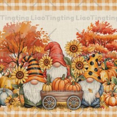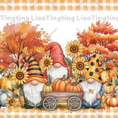 Thanksgiving,Autumn,Gnome,Pumpkin,Wood Grain,Leaves,Sunflower,Plaid,Cart