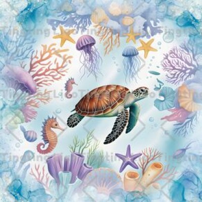 Turtle,Ocean,Fish,Starfish,Jellyfish,Coral,Conch,Seagrass,Watercolor Style