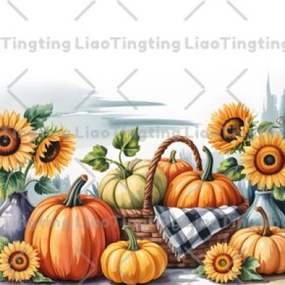 Autumn,Thanksgiving,Pumpkin,Flower,Vintage Style,Sunflower,Bamboo Basket,Watercolor Style