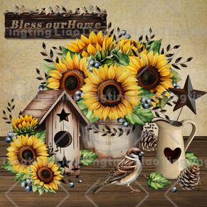 Farmhouses,Sunflowers,Sparrows,Pine Fruit,Village Heart,Text,Countryside,Leather Paper Background