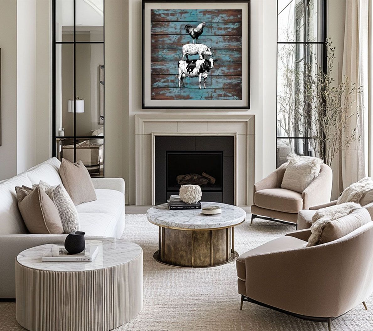 Farm Animals,Cow Pig Chickens,Countryside,Vintage,Blue Woodcut