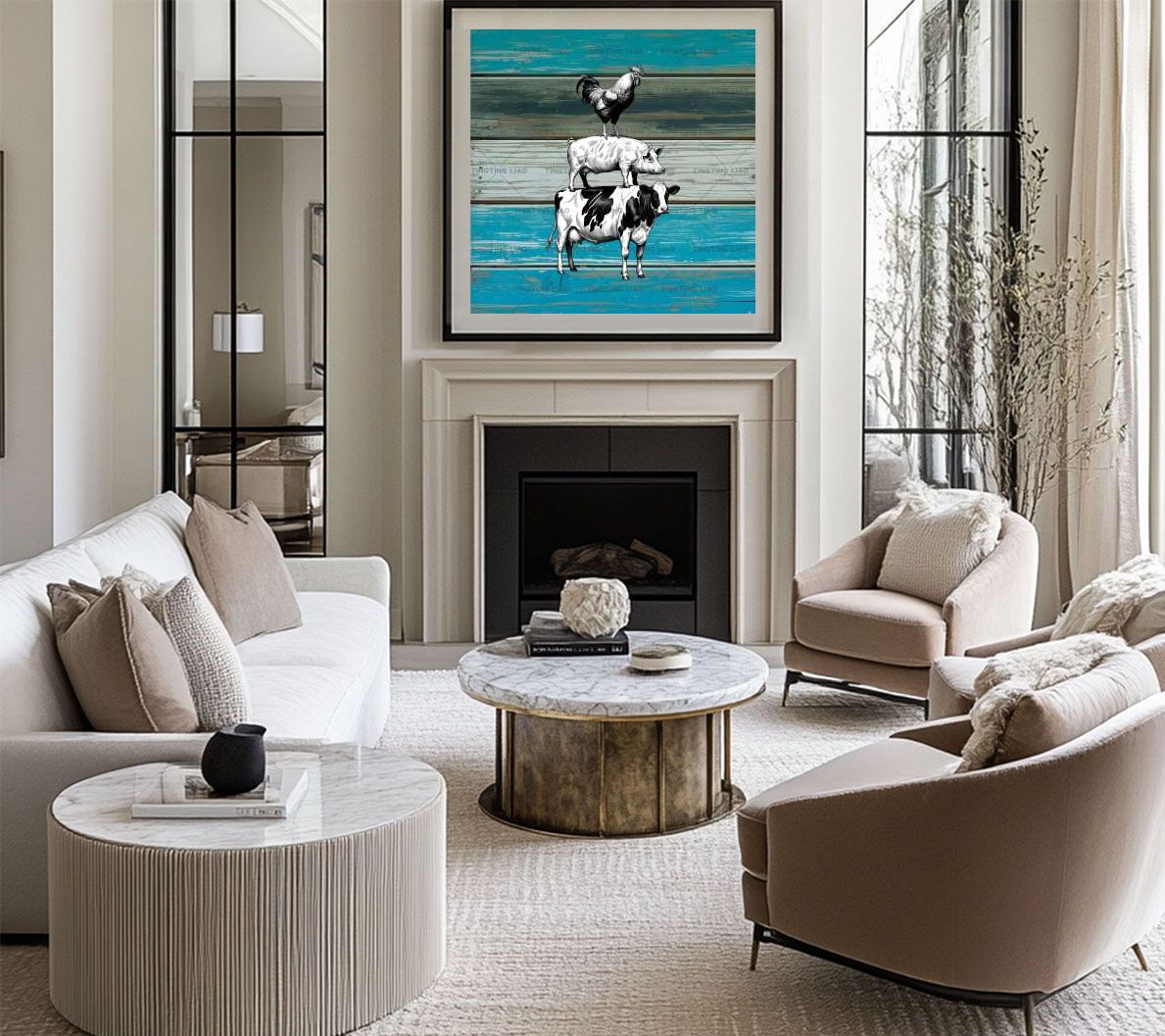 Farm Animals,Cow Pig Chickens,Countryside,Vintage,Blue Woodcut