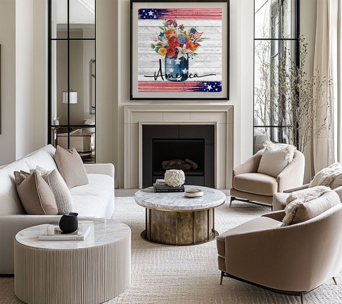 Spring,Independence Day,Flowers,U.S. Flag,Yumei,Daisy,Watercolor Style,Woodcut